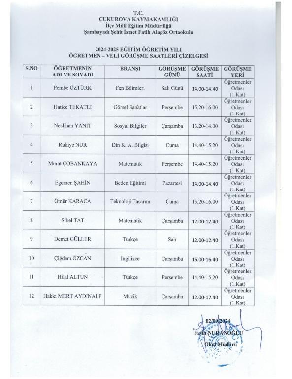 ÖĞRETMEN-VELİ GÖRÜŞME SAATİ ÇİZELGESİ